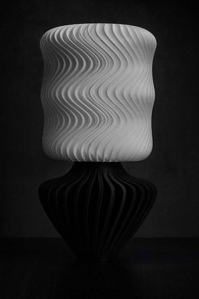 Bring movement to your space with the Wave Table Lamp, a 3D printed masterpiece that captures the essence of motion in still form. With its undulating white shade and vertically grooved black base, this lamp creates a harmonious contrast that’s both modern and timeless.